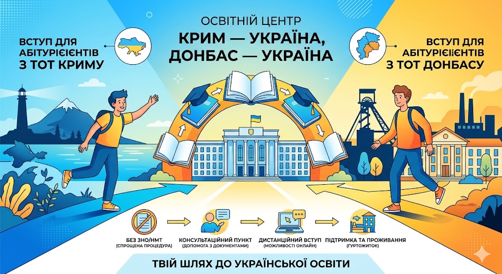 Освітній центр «Крим – Україна”, “Донбас – Україна», працює із особами, які проживають на територіях, де не можливо забезпечити виконання стандартів освіти України та/або стабільний освітній процес та надають можливість особам з цих територій вступати на навчання до Університету в межах встановлених Правилами прийому за спеціальними умовами вступу.